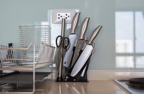 A well-equipped kitchen with a full range of cutlery, dishes, glasses.