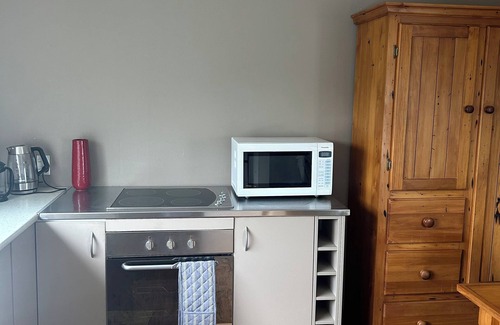 Open plan Kitchen, dining and living room. Modern full kitchen including dishwasher, oven fridge and dinning table that seats 4. Living room includes a couch and TV (Netflix and WIFI). This comfy space has sea view’s from the large kitchen window and glass sliding door. There is also a Heat pump and carpeted floors in the living room.