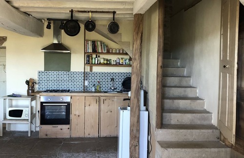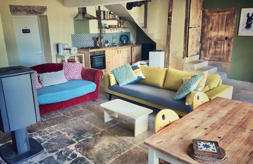 Set on the outskirts of a beautiful medieval village and attached to the end of our long farmhouse is our cosy gite with a wood burning stove. Downstairs you'll find a large spacious living room and kitchen, boasting beautiful flagstone floors, exposed wooden beams and an enticing winding stone staircase that leads to the first floor bedroom.