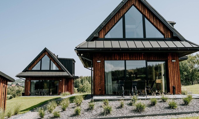 On the edge of a small Podhale village, at an altitude of 545 meters above sea level, in a beautiful, vast area, in the vicinity of only 20 m from the forest, the hosts have created a paradise for idyllic, undisturbed rest. There are 2 luxurious, but also atmospheric holiday houses, a common relaxation area with a heated tub, and the best thing for the youngest - a lot of free, green space. A comfortable house (large glazing, loft-industrial style) has been designed for accommodation of up to 8 people. It consists of 2 levels. Open ground floor with fully equipped kitchen, living room and bathroom with shower. The living room has a large TV, a 2-seater sofa and a table with chairs. In the bathroom, there is a private sauna (a 2-hour session every day is included in the price of the stay; essential oils for aromatherapy are available) and a washing machine. There are 2 separate bedrooms upstairs. The house has a balcony and a covered terrace with a set of garden furniture. The house has air conditioning with cooling and heating functions, which ensures comfortable rest at any time of the year. Wireless internet is available. The area of the entire property is at the common disposal of guests from 2 houses. A big attraction is a common terrace with a tub with heated water and hydromassages located in the central point of the area (extra charge). There are also barbecue facilities, a place for a bonfire and a parking lot. On request, a masseuse arrives, offering relaxing massages, hot chocolate, hot stones, etc. Included in the price: bed linen, towels, electricity and water consumption, air conditioning, sauna (2 hours/day), final cleaning, internet, parking. Baby cot and high chair on request (prior request required). Attractions in the area: The property is located right next to the forest. Depending on the season, you can fill baskets with mushrooms and berries, run in the morning on wet dew, in the evenings fry sausages on the fire and admire the spectacular sunsets from the terrace. Throughout the year, the mountains encourage trips: the Tatra Mountains or, closer to Stare Wierchy, Turbacz. Bicycle trips in the summer, and skiing on the surrounding slopes in the winter: the "U Żura" ski lift, the Beskid Spytkowice ski complex, Kasina Ski&Bike Park or a little further, Kotelnica Białczańska. The hosts know where you can eat well and where they brew the best coffee in the area and they want to share all this with guests. One of the biggest attractions in the region are thermal baths, which guarantee an unforgettable experience for adults and children. There are several resorts to choose from within a radius of 30 km: Termy Bania, Termy Chochołowskie, Termy Szaflary. A stay with us is the perfect time to go on hiking trails, the views of which are breathtaking. We are located in Podhale, so you can choose between easier and more difficult trails with beautiful views of the Polish Mountains. For beginners, we recommend routes to Krzywoń, Babia Góra or Turbacz, while experienced enthusiasts of mountain hiking can take advantage of more difficult parts, e.g. going to Kościelec or Czerwony Wierchy. Local cuisine is another attraction worthy of attention. There are many recommended restaurants nearby that serve delicious highlander dishes made from fresh, regional products. Traditional highland cheese (oscypek) is sold just around the corner.