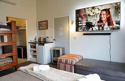Self-contained motel-style room with king-size bed, a set of bunk beds and ensuite bathroom.