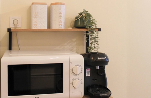 The apartment is bright and includes a comfortable living area with a sofa, a TV, and fast Wi-Fi, perfect for relaxing or working. You will also find a practical kitchenette equipped with a microwave and a coffee machine for your breakfasts or light meals. A hairdryer and an iron are also available to ensure your comfort throughout your stay.
