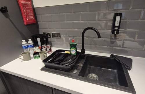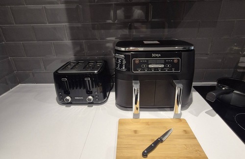 The dining area has comfortable seating, dinnerware, cutlery, and wine glasses, making it ideal for enjoying meals at home. The fully equipped kitchen features a Ninja dual stack air fryer, kettle, toaster, and all the cookware you need. Complimentary tea, coffee, sugar, milk, biscuits, and soft drinks are provided to help you settle in.
