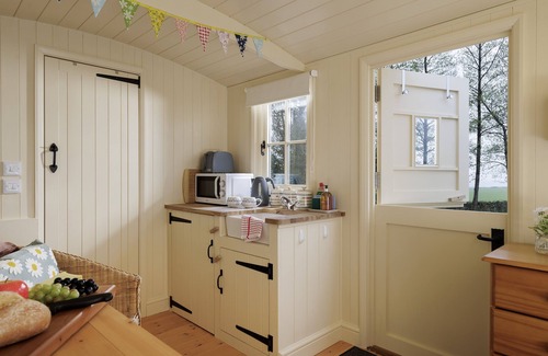 Cotswold Nest features an open-plan layout, thoughtfully designed to maximise space while maintaining its original character. The living area boasts a cosy wood burning stove, perfect for the cooler evenings, and large windows that frame stunning views of the surrounding countryside. The kitchen is compact yet well-equipped with a sink, a fridge, and microwave ideal for preparing simple meals or enjoying breakfast in bed.