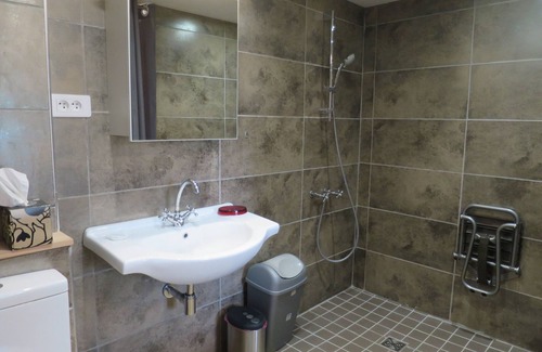 Bathroom open to the bedroom (separated by an opaque curtain) with toilet, sink and shower with adjustable stool suitable for wheelchairs.