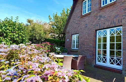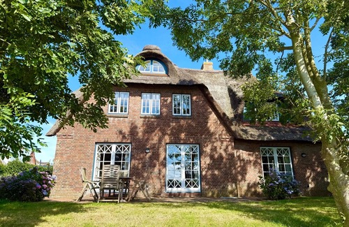 Arrive and breathe deeply, this house leaves nothing to be desired: from the small group thatched roof houses it is in the front line to nature with a free panoramic view of meadows and the dike. Here you will probably experience the most beautiful sunsets Föhrs on your doorstep. Enjoy the spaciousness of the light-flooded rooms with high-quality terracotta, wooden floorboards or parquet floors, and the unique views from each window. The 750 m² garden offers you the flexibility to always find a sheltered shade or sun place to feel good, depending on the time of day and the weather.