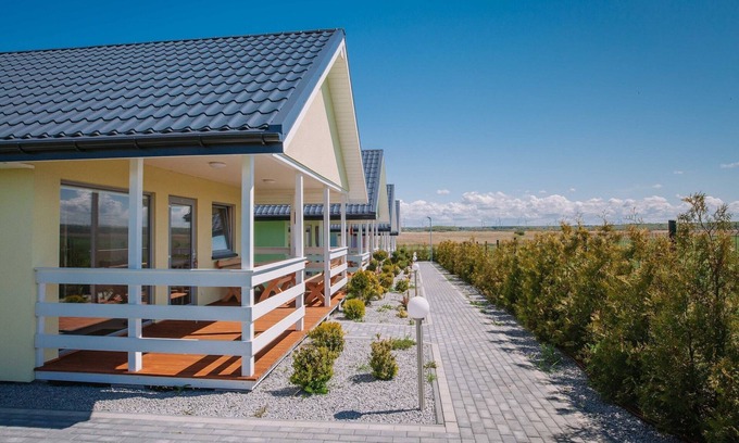 In a quiet area, on the outskirts of the summer village of Bobolin, 1.4 km from a beautiful, sandy beach, there is a family holiday center that offers comfortable accommodation and plenty of space for children's games. There is a row of 8 single-story houses on the fenced property. Each house has a covered terrace with a set of garden furniture and barbecue equipment. The house consists of a living room with a kitchen, a bathroom with a shower and 2 separate bedrooms. The living room has a fold-out 2-seater sofa, a table with chairs and a TV. The cottages can be heated on colder days. Wireless internet is available. In the vast area of the holiday resort, most of the space has been designed with the youngest in mind. There is a very large, attractive playground here. Parking on site (partially covered). There is also a table tennis table and table football. The price of the stay includes: bed linen, towels, electricity and water consumption, internet, parking, final cleaning. A baby cot and a high chair are available upon prior request. Attractions nearby: The biggest attraction of the area are the clean, wide and unpopulated beaches stretching from Dąbkowice in the west, through the health resort of Dąbki, Bobolin, Darłówko, to the summer village of Wicie in the east. They encourage healthy walks and carefree sunbathing. A bicycle path runs along this entire coast, thanks to which you can conveniently commute and visit neighboring seaside towns. There is also Lake Bukowo nearby - a real paradise for sailors and windsurfing enthusiasts. There is a water equipment rental shop and even a small beach by the lake. There is also a stud farm in the vicinity of the center, which invites horse riding enthusiasts for rides in the paddock and off-road riding.