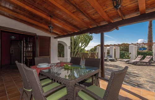 Relax into the serenity of this romantic cottage, secluded on a 10,000 m² farm only 6 km from the sea, outside Ingenio. Surrounded by greenery and devoted to tillage, this peaceful retreat unites rustic atmosphere and contemporary luxury. The house's interior reflects a tasteful mix of wood and stone, generating a cozy, welcoming ambiance. The house consists of two comfortable double bedrooms and two single rooms, offering generous space for families or small parties. With two bathrooms, a spacious kitchen with a dining space, and a large living room with a beautiful fireplace, you'll have all you need for a comfortable stay. This charming cottage is ideally located for exploring nearby attractions. You’ll be just a short drive from the coastal town of Ingenio, offering easy access to beautiful beaches and local shops. For those seeking adventure, the island's hiking trails and scenic viewpoints are within reach, offering a chance to experience the natural beauty of Gran Canaria. Additionally, the famous town of Agüimes, known for its charming old town and historic architecture, is nearby. Outside, relax in the serene atmosphere on a lovely terrace beneath a classic Canarian hanger, ideal for eating alfresco or just relaxing in the fresh air. The terrace opens onto a spacious patio, where there is a barbecue space and sun loungers, where you can soak up the wonderful sun and take in the splendor of the surrounding country. Whether you’re cooking up a meal on the grill or basking in the sunshine, this outdoor space is ideal for relaxation and family gatherings.
