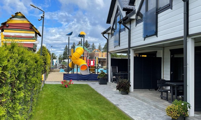 A family holiday resort in a very quiet area, 200 m from the beach. Just a few steps to the resort center. On the fenced property there are 11 comfortable, terraced holiday cottages and a sauna (for an additional fee). Each cottage is comfortably equipped and tastefully decorated. The houses are two-story. On the ground floor there is a spacious living room with TV and table. The living room is connected to a well-equipped kitchen (including washing machine, dishwasher, coffee machine). There is also a bathroom with a shower on the ground floor. On the first floor there are 2 large, separate bedrooms. The houses have covered terraces with a set of garden furniture and barbecue equipment. The houses have air conditioning with cooling and heating functions, which makes your stay comfortable at any time of the year. Wireless internet is available. There is a very attractive playground for the youngest, as well as a nice and well-equipped playroom. There is a bicycle rental service, as well as a sauna and whirlpool (for a fee). The price of the stay includes: bed linen, internet, parking, baby cot and high chair (registration required). Sianożęty is a small holiday resort located approximately 10 km from Kołobrzeg, in the immediate vicinity of another seaside resort - Ustronie Morskie. Sianożęty is located right next to a wide beach. Golden sand and gentle access to the sea encourage vacationers to sunbathe and sea. In the neighboring Ustronie Morskie there is also a 100-meter long walking pier. The R-10 international bicycle route runs through Sianożęty. It runs along the coast and provides amazing views of both beaches, clear sea and charming peat bogs. From here you can get easily and pleasantly by bike to the nearby Ustronie Morskie, but also to the large city of Kołobrzeg.