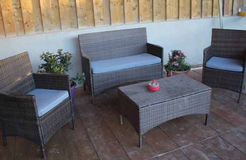 The cottage has a small private terrace that can be used as an outdoor lounge in fine weather. The pieces are in a row.