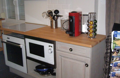 A fitted kitchen: oven, microwave, fridge, hood, dishwasher, induction hob, espresso coffee maker, kettle, toaster,. All dishes for 6 people. The appliances are new.