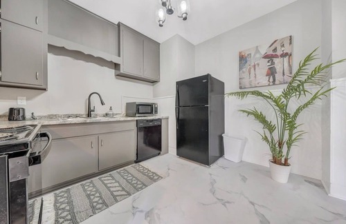 Guests will enter through the front door using a lockbox and traditional key. Immediately inside is the dining room with an ornamental fireplace and dining table for four. Through the dining room is the living room with a chaise sofa, a comfy chair, and a tv. Beyond the living room is the fully-equipped kitchen. We provide essential kitchenware items so you can prepare meals during your stay. A hightop counter in the kitchen with three stools adds additional seating space for meals.