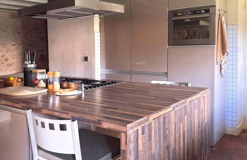 The house is composed of two separate spaces: the main house (with the leaving room, dining room, the kitchen, 2 bed rooms, 2 bathrooms and a working space) and the "dépendance" (studio with a big bedroom and a private bathroom).