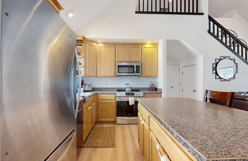The main living area creates a cozy, family-friendly atmosphere, with a well-appointed full kitchen and spacious dining area for big group meals.