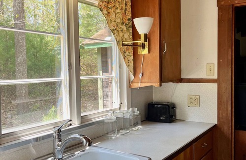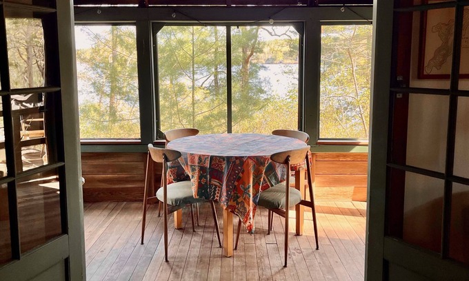 The Palace offers accommodations for up to six people. There are two bedrooms, one with a queen bed, and one with a queen bed and two twins (bunk bed style). The galley kitchen has plenty of cooking utensils and dishes. The screened porch is set up for dining alfresco while enjoying a great view of Long Pond.