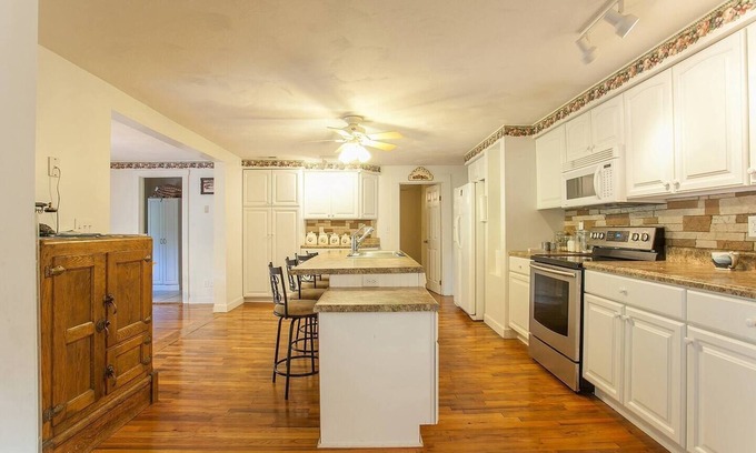 This home has three bedrooms with an additional office converted to bedroom** and two bathrooms. The master bedroom has a king sized bed while other two bedrooms have queen beds. There are two dens, one is perfect for closing off for some quiet time with your favorite book and the other is more of a living space with a smart TV for streaming. The reading room does have a pull out couch that can sleep two. The dining room has seating for 6 with an additional four bar stools. The house is stocked full of just about every kitchen gadget, utensil, pot and pan you could ever need. The owners are huge boardgames advocates so have plenty of board games that are rotated through the home.