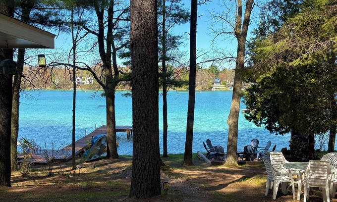 Our hidden gem awaits you! Enjoy the spring fed crystal clear water, with sandy shoreline, on full recreational lake, Stratton Lake. Enjoy your day fishing, swimming, jumping off the swim raft, skiing, tubing or boating followed by stunning sunset views and campfires at night. Kayaks, paddleboards, and paddle boat available for use or bring your own boat and tie off on our dock. Located minutes away from shops, historical sites, grocery stores, entertainment, attractions, restaurants, Hartman's Creek State Park, and the Chain O' Lakes. The cottage features a large living room with stunning lake views and a pull out queen sofa bed. There is a king bed in main bedroom, two full beds in second bedroom. Enjoy the view in our 4 seasons lake view room, full bathroom, kitchen and outside dining area with gas grill as well as an outdoor shower. Minimal slope provides an easy stroll to the waters sandy bottom shore and dock. There is a public boat landing on W. Stratton Lake Road to launch your boat. The perfect location for your lakeside get-away to relax and make memories! There is room for two vehicles in our drive way otherwise side road parking is an option if you have a vehicle with trailer. Onsite firewood is available for purchase. We have a Maui mat available for rent as well.