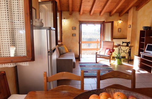 The Relax cottage is a spacious and bright 60 sqm apartment on the mezzanine floor, suitable for 4 people. The entrance is independent and is accessed by a large porch, where you can have lunch or dinner during the summer. The living area is composed of a living room with a fully equipped open kitchen with appliances, a dining area with a table, a bench and chairs, a comfortable sofa bed, a TV, a relaxing chaise lounge and a wood-burning stove to complete the decor. The open space overlooks a panoramic balcony overlooking the vineyards. The sleeping area consists of a large double bedroom, a bathroom with shower.