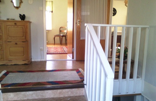The living area is approximately 110 m² and can accommodate up to 7 adults and 1 toddler. Staircase, The rooms are distributed on two floors. Since the house in the back has a slight hillside, the "upper area" is actually the ground floor. In the upper area there are living and dining room, the kitchen with dining area, two bedrooms and the bathroom. The kitchen is very well equipped and has a dishwasher and a 4-ring ceramic hob with oven. Next to the kitchen is a bedroom with two single beds. The large and open living and dining area is furnished with a TV (German channels) and a dining table. The fully glazed conservatory is accessible via the living area. The second bedroom has a double bed. The first of the two bathrooms has a bath and a toilet. About the stairs in the entrance area it goes to the "lower floor". On the right side is another bedroom with a single bed that can be separated by a curtain. The 4th bedroom is in the room next to the open bedroom and has a double bed. The second bathroom is opposite the open bedroom and has a shower and a washing machine.