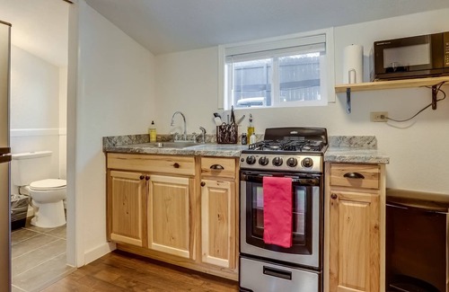 Walk from the main area to the kitchen where you will find a refrigerator, gas stove/oven, toaster, microwave, coffee and all the cookware and dishes you need! Enjoy small dining table set for two in the main living area. If you prefer to grill then walk out the back door to your own fenced in private patio with your own private hot tub to relax and unwind.