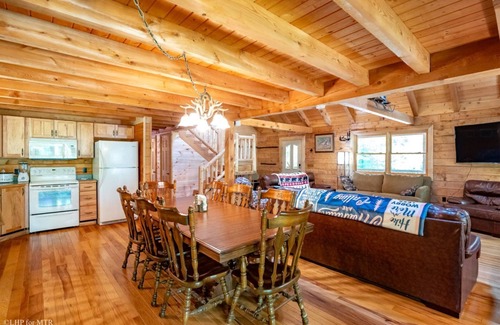 Countless Adventures offers the classic log cabin look with custom updates and unique amenities, designed with vacation in mind.The upstairs loft is sure to provide hours of fun for kids and adults alike with a shuffle board with bowling table, Tokyo Drift racing arcade game,a golf putting mat, table top foosball, a take and leave library,plenty of seating to enjoy the 65 inch smart TV with video gaming console that offers 117k games from multiple platforms (streams easy with the cabin’s high speed wi-fi), and other toys and games.