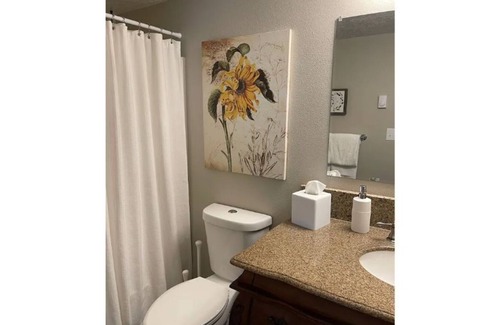 Amenities include fully stocked kitchen, air-conditioning, Wi-Fi, shower/tub. Lots of free parking, 55" smart TV, office space, coffee and tea provided, along with a self check-in smart lock.