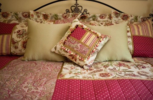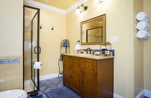 Bright and inviting, this king-sized room speaks to the whimsy of country fun. The custom quilted bed linens are set off perfectly by old-fashioned yellow rag rugs. Birdcages, straw hats and a wicker rocker all speak to a slower pace of life. The large bath has both a shower and 2-person soaking tub along with a wide granite-topped vanity.