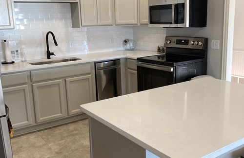 The newly remodeled kitchen offers stove, refrigerator, dishwasher, microwave, and breakfast/work island, along with all utensils and dishes needed for cooking and serving meals.