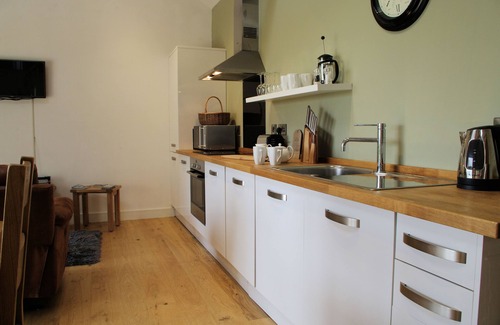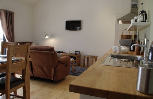 Access is either along an easy ramp or four stone steps to a raised, flagged patio at the front of the cottage. Entry is through large bi-fold glass doors to the spacious open plan lounge with reclining sofas, dining area and kitchen. The ceiling is lofted to the rafters exposing the roof beams and trusses with natural light spilling down from a central skylight. To the side of the lounge at the front is a bedroom with double bed and built in wardrobe, off the lounge to the rear is a fully tiled shower room with washbasin and toilet, both with skylights.