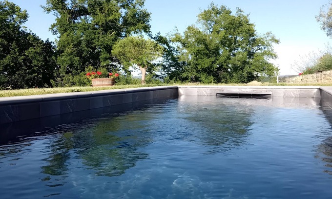 Nestled in greenery, with breathtaking views of the surrounding countryside, the property boasts a private pool and Nordic bath heated to 38°C continuously. The temperature is effortlessly maintained - slip into the warm water at any time, and let yourself be enveloped by a deep sense of well-being.