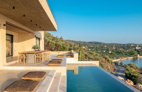 Finca Villa Myporos in Poros provides 357 sqm of space for up to 16 guests with 8 bedrooms and 7 bathrooms spread across 3 floors. You have access to air conditioning throughout all rooms, an elevator, and step-free interior access. Private amenities include WiFi suitable for video calls, TV, video on demand, dedicated workspace, washer, dryer, baby bed, highchair, beach towels, and 8 private balconies with 8 private uncovered terraces. The property offers mountain and sea views from its hilltop location and features a minimalist style design that complements the area's landscape.
