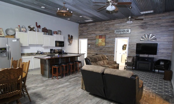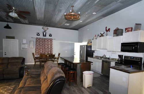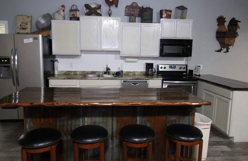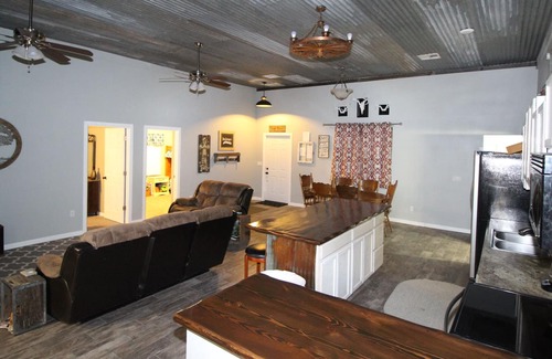 The Farm House is a 1500 sq ft shop building that we turned into a beautiful 4 bedroom retreat. The outside may not be much to brag about but wait till you walk through the front door. You will be blown away with the unique country charm. We have made every effort to make this place as warm and inviting as we possibly could. You will be in the country but close to everything in the Tulsa Area. The Farm House sits on the top of a hill looking down into the valley.
