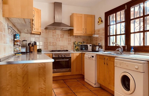 Villa Facilities: Kitchen is equipped with a fridge freezer, ceramic hob, oven, dish washer, washing machine, electric kettle, toaster, microwave oven, and full range of crockery and cutlery. All bedding has duvet covers, iron and iron board, vacuum cleaner, electric fans and electric heaters supplied on request. TV and satellite, having 154 stations in english ie BBC, ITV, Sky news and sports, BT, and more, as well major TV stations of countries such as Germany, Norway, Holland, Spain, Italy France, Sweden, Poland and more. DVD player, radio and CD player WI-FI . Villa has four covered terraces with pergolas, and one large terrace round the pool and high terrace for sunbathing. Beach towels, bath towels and linen are supplied and changed on a weekly basis.