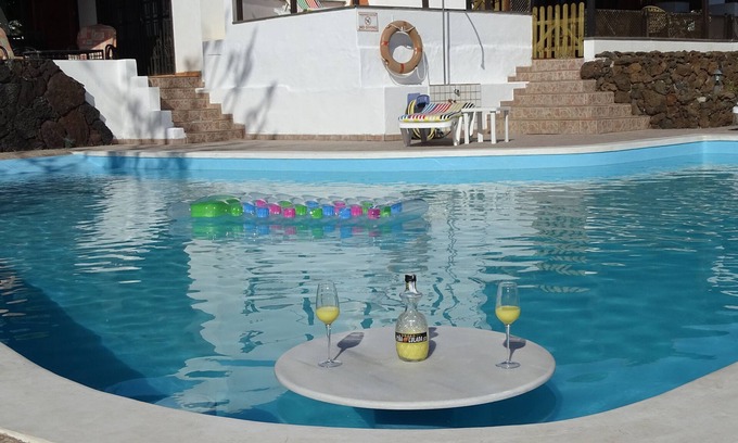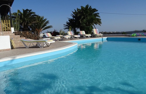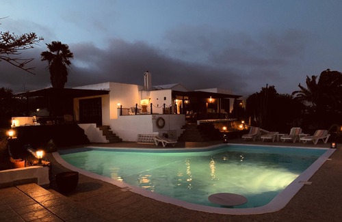 Finca Style Villa, overlooking the ocean, with the Old Town of Puerto del Carmen and Puerto Calero on one side and the island of Fuerteventura on the other. The villa has no immediate neighbours, making it great for evening BBQ , and relaxing sunbathing, yet only 5min drive to beaches, supermarkets,bars and restaurants. This beautiful spacious villa is furnished to a high standard, has a large double living room with fireplace and lava walls, with patio doors opening to two terraces overlooking the large L shaped 5 x9 x5x5mt pool having a walk in to a depth of 1.6m a round marble table and four stools in the pool ,making it ideal for children, elderly and incapacitated persons..The pool is heated by solar and electric heat pump. It is salt cleaned, no chemicals added. The main terrace overlooking the pool has a large built in BBQ, and large table it is gated so young children cannot wonder to the pool unattended, giving peace of mind to the family.
