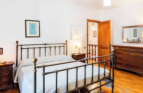 Bedroom 2: This first-floor bedroom has a wrought iron double bed, a spacious wardrobe, chest of drawers and French windows opening onto the balcony.