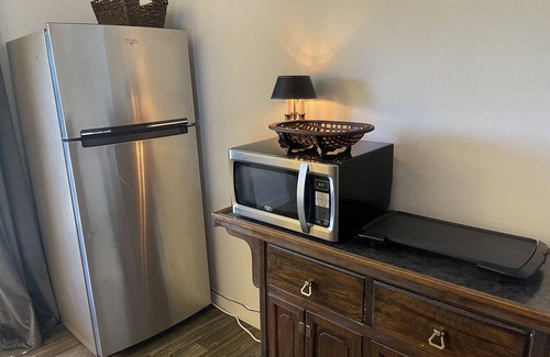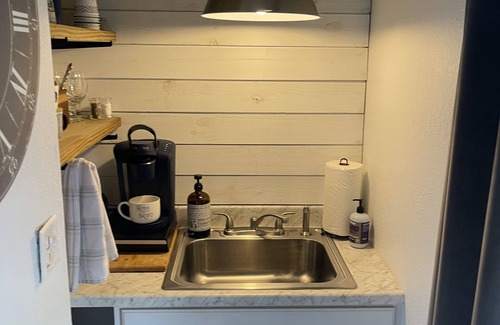 The floor plan is open, with a king bed and living room together. Satellite TV and Wi-Fi are provided. There is a self-inflating queen size air-mattress available with plenty of extra linens, as well as a very comfy large couch. Kids are welcome to play in the tree house behind the main house and there is a dog run and kennel available behind the cabin. (Dogs must be approved prior to booking). The parking area for the cabin is large enough to park additional guests and/or trailers. The kitchen does not have an oven, but does offer a full size fridge, microwave, griddle and two burner cook-top, as well as a Keurig coffee maker. Charcoal grill (with supplies provided) outside on porch.