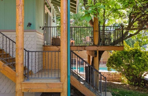 Guests of The Tree House enjoy shared resort-style amenities: an unheated pool, hot tub, pool bar, grills, outdoor dining area, fire pit, creek access, and outdoor gathering spaces.