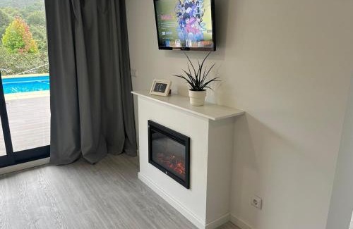 Coura Lodge offers accommodations in Paredes de Coura, 30 miles from Shipyards of Viana do Castelo and 17 miles from Golfe de Ponte de Lima. This property offers a private pool, free Wifi, and free private parking. Outdoor seating is also available at the vacation home. Featuring a terrace and mountain views, the vacation home includes 1 bedroom, a living room, cable flat-screen TV, an equipped kitchen, and 1 bathroom with a shower. Towels and bed linen are available in the vacation home. There's also a seating area and a fireplace.