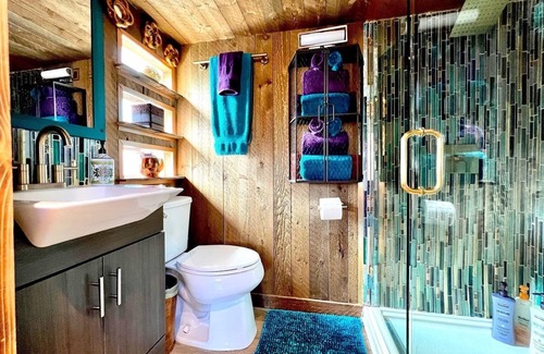 Melchizedek is an old world themed tiny with every convenience built in. Aptly named after the righteous king in the classic biblical story of ancient times; this unit is an epic hybrid- the luxury suite of tiny homes! The attached shipping container behind includes King and Queen secret chambers. Kitchen appliances, a full bathroom (walk in shower), cozy loft, amazing views, washer/ dryer combo, TV, Wifi, Hot Tub, Fire Pit, BBQ grill and all the outdoor amenities to go along with it!