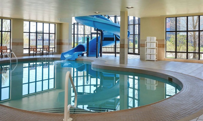 Recreational amenities at the hotel include a waterslide, an indoor pool, and a 24-hour fitness center.