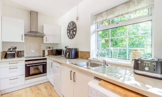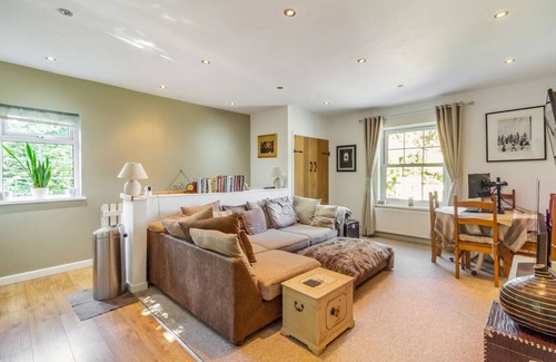 The first-floor living area boasts an open-plan layout with a fully equipped kitchen, dining space, and a cosy lounge that takes full advantage of the scenic countryside views. The cottage features three spacious double bedrooms, including one with a private en-suite bathroom. The remaining two bedrooms share a contemporary family bathroom with a shower overhead, ensuring a comfortable stay for all.