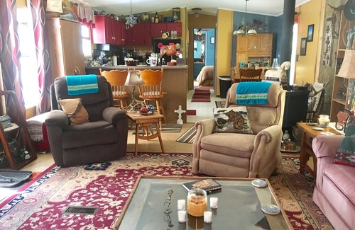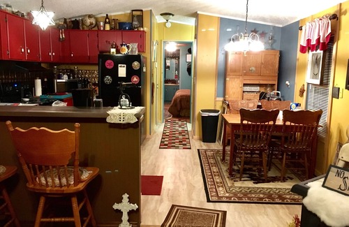 Our Guest House is a cute roomy remodeled Vintage Mobile Home that is comfortably decorated in a Southwestern style and affords you with everything you need for a relaxing stay. From a comfy new King Bed with fluffy pillows to a new double Shower with soft towels and plenty of hot soft water! Upon arrival you will be greeted with assorted snacks and bottled water. In the morning enjoy assorted breakfast foods and the coffee bar to get your day started. Enjoy your coffee out on the new deck, absorbing the sounds of Nature and just feel your stress melt away! The kitchen is complete with dishes, pans, utensils and silverware. Also there is a Weber Charcoal Grill and a Gas Grill should you wish to bring along something to grill! The huge Fire Pit is available for a bonfire and star gazing! Wood provided. ( Check with Host for a Burn Ban) If your seeking country quiet then this is the place to get away. If you still need to relax but not the outdoor type we have many movies, books, games (for both children and adults) and Direct TV with HBO, and ESPN that you may enjoy on the sofa bed or 1 of the 2 comfy recliners! We now have Starlink Internet!! You will have access to Netflix, Amazon Prime and HBO Max by using your own Passwords to your personal accounts.