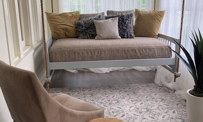 Step into our cozy two bedroom, two bathroom cottage, a true home away from home. With its quaint charm, and inviting atmosphere, our place offers the comfort and warmth that’s hard to find anywhere else when traveling. The sunroom, complete with a hanging daybed and a peaceful office nook, provides the perfect spot for relaxation or creativity. The beds are luxuriously, comfortable, ensuring your rest, easy during your stay.