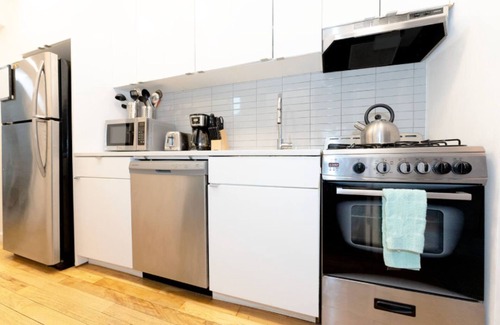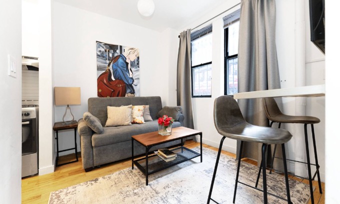 Welcome to your perfect getaway in Upper Manhattan! This cozy 550 Square feet two-bedroom, one-bathroom apartment is just steps away from Riverside Drive and the Hudson River. Enjoy a private entrance, a breakfast bar for two, and a living room with a pull-out queen-size sofa bed. The fully stocked kitchen has everything you need for home-cooked meals, and the bathroom includes complimentary toiletries.