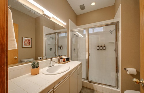 The first floor bedroom features a king bed, flat-screen smart-TV, and adjacent bathroom with a tub-shower combination. The second floor bedroom features a queen bed and adjacent bathroom with a step-in, double-head shower! Each bath is stocked with fresh towels and Public Goods shampoo, conditioner, body wash, and lotion.