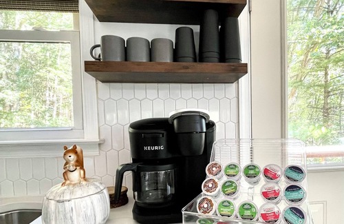 The kitchen (located on the upper level) is equipped with all your basic appliances including a microwave and dishwasher and comes fully stocked with cookware, utensils, plates, etc. You'll find most of your basic kitchen necessities like paper towels, dish detergent, trash bags, are included as well.