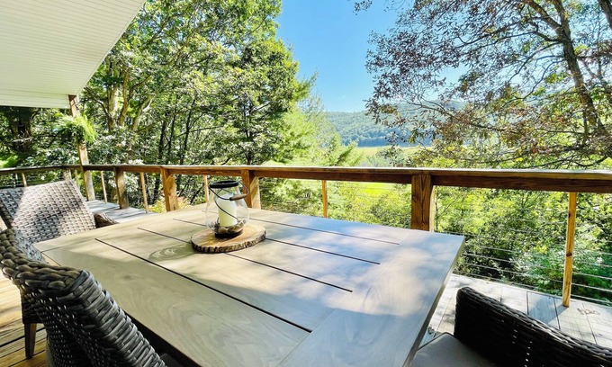 Our mountain home is located in Franklin, WV near West Virginia's Monongahela National Forest in a quiet, residential area surrounded by woods with a lovely view of the nearby mountains and a glimpse of the South Branch of the Potomac River. The surrounding woods provide privacy from neighbors. The wooded, gravel drive (including one, steep hill approaching the house and one hill to the upper parking) puts you at just the right elevation to provide the amazing, tree top view from the back porch. Our home has had over 200 5-star reviews since listing in 2001 on multiple platforms. This updated listing includes our newly finished lower-level or basement spaces including king bedroom, full bath, and tv/movie lounge area for those wanting to stay with a larger group.