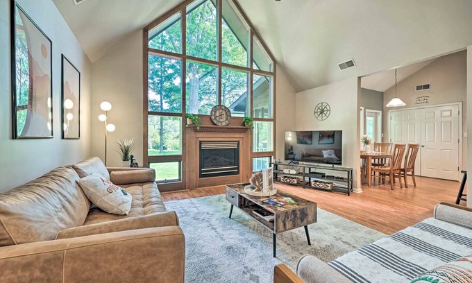 INDOOR LIVING: 4 Smart TVs (w/ YouTube TV), allergy-friendly mattresses, breakfast bar, jetted tub, shower/tub combo, washer & dryer, floor mirror, ceiling fans, cathedral ceilings, fireplace (decorative only)