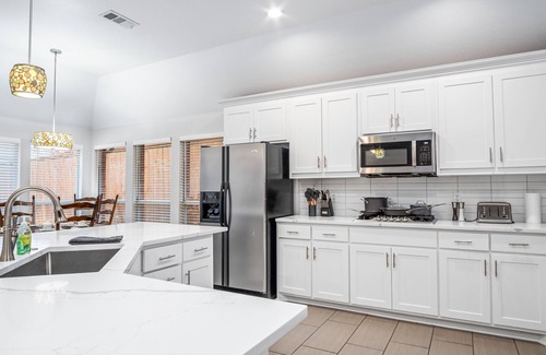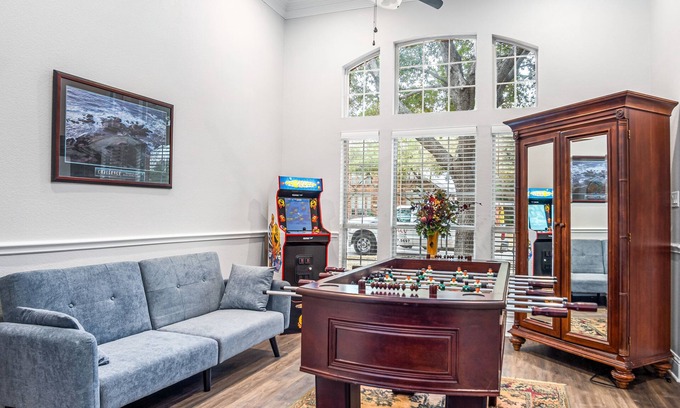 Retreat to the refined elegance of our 4-bedroom sanctuary, minutes from Curtis Culwell Center and Firewheel Golf Park. Luxuriate in the master suite with a stately four-poster bed and sumptuous ensuite. Comfortably spacious for 10 guests, it features an open floor plan and a game parlor with foosball. Relish the outdoor tranquility with our BBQ grill and radiant firepit on the elegantly lit patio. An idyllic setting for families or groups seeking relaxation with a touch of local charm.
