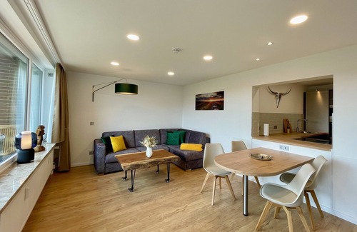 Die komfortable und exklusive Ferienwohnung befindet sich in der 2. Etage eines schönen Domiziles mit bestem Ausblick auf Wald, Berg und See direkt im Luftkurort Hahnenklee und wurde 2022 komplett saniert. Sie bietet auf 60 qm viel Platz für bis zu 3 Personen. Der gemütliche Wohnbereich besitzt ein bequemes Ecksofa, welches sich mit wenigen Handgriffen zu einem Bett (1,50m x 2,00m) umfunktionieren lässt, und sorgt mit einem 75“ Flat Screen-TV für reichlich Entertainment.